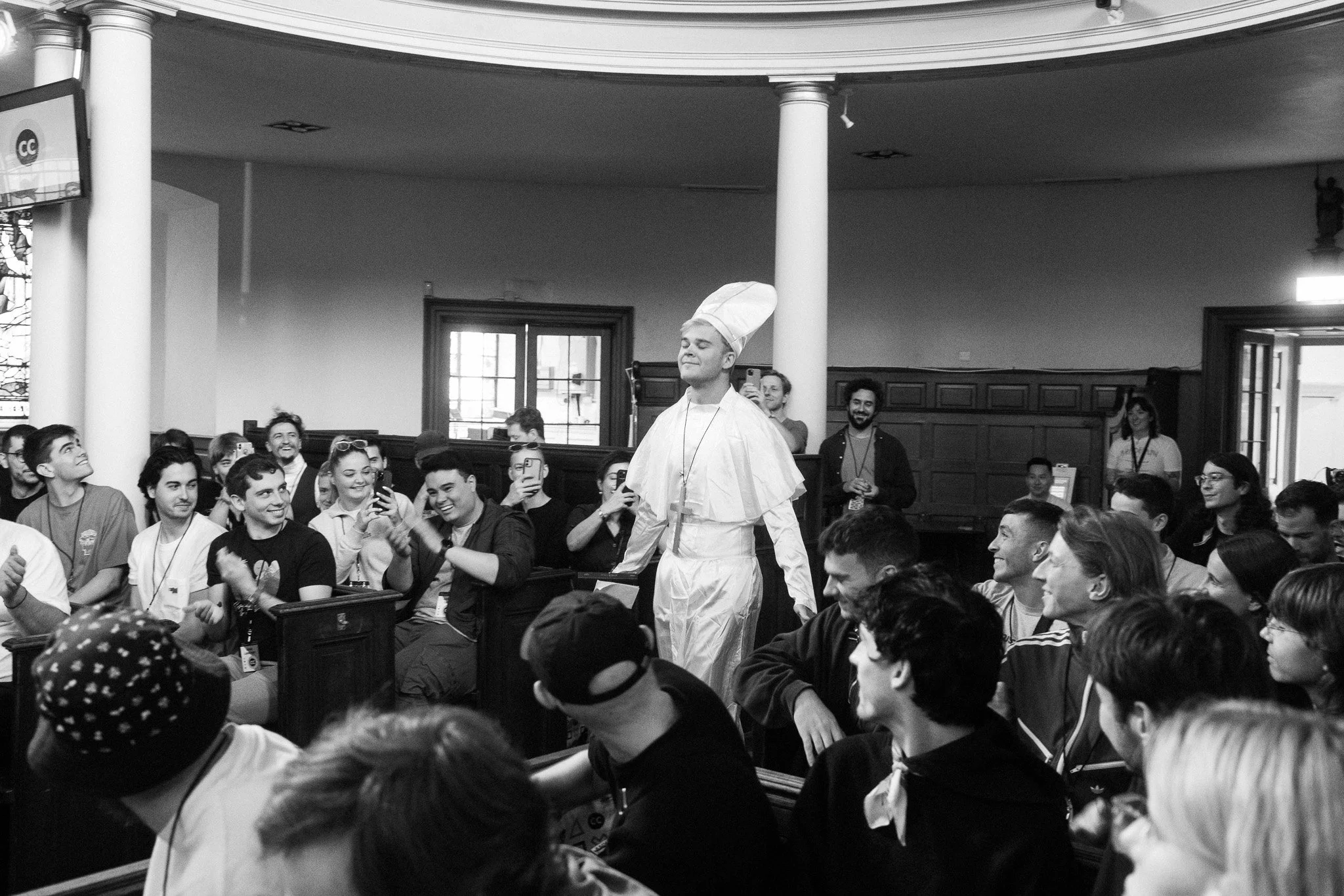 Oliver entering the stage dressed as the pope at Cardistry Con in London, 2023.