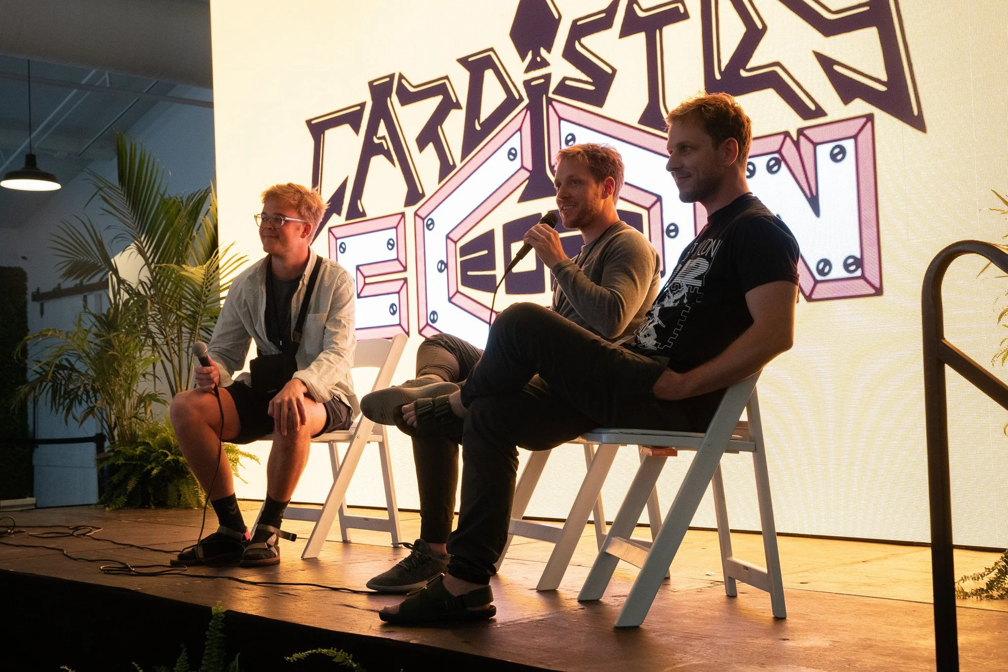 Oliver interviewing Dan and Dave Buck for a Q&A on stage at Cardistry Con in San Diego, 2022.